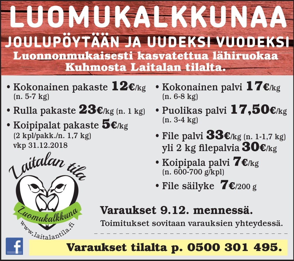 Palvikalkkunan varaukset pyydämme tekemään 30.11. menneessä, jolloin toimitukset 9.12. alkaen. Pakasteiden varaukset pyydämme tekemään 6.12. mennessä, jolloin toimitukset viikolla 50. Toimituksesta sovitaan varauksen yhteydessä.