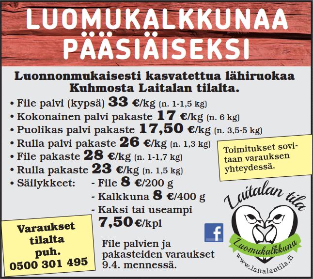 Kokeile tänä vuonna pääsiäispöydässä luomukalkkunaa. Toimitamme tilaukset Kainuun alueelle, jolloin varausten yhteydessä sovitaan tarkemmin toimituksesta. Tilaukset pyydämme tekemään  keskiviikkoon 21.3. mennessä puhelimitse 0500 301 495.